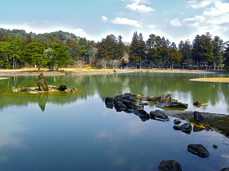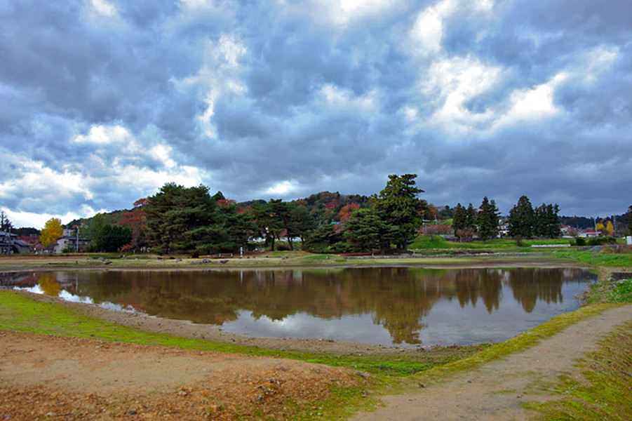 The Kanjizaio-in site shows ruins of a temple that was built by the wife of the second Oshu-Fujiwara lord, Motohira. The Jodo garden, centered around Maizurugaike Pond spreading in front of the large and small Amidado ruins, and behind the grounds Mt. Kinkeisan can be found.By the modern age, all pagodas have been lost and the gardens devastated, later becoming rice paddies. However, the remains of the great halls and gardens were restored and maintained based on results of excavations of the ruins, so that we can see them as they were today.The World Heritage Committee gave high evaluations to Kanjizaio-in, Motsu-ji and Muryoko-in Ato, adding that they are properties “constructed as a symbolic expression of the Buddhist Land (Jodo) in this world.”