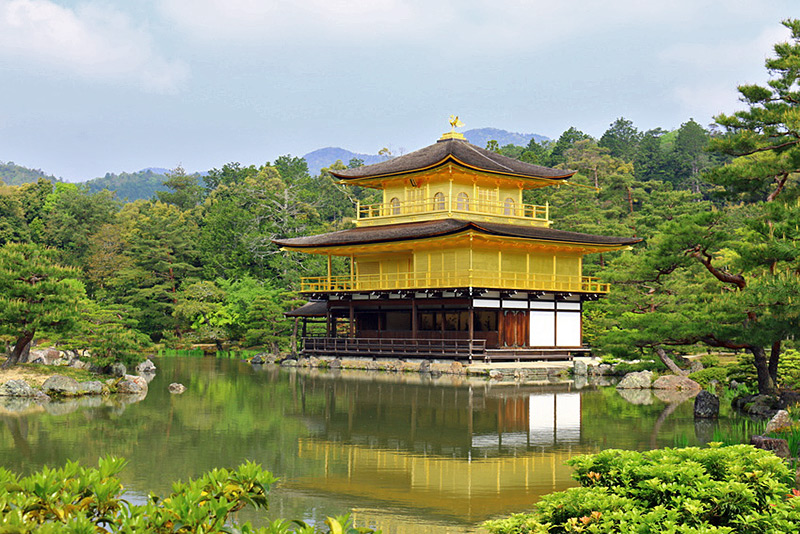 The image of the temple richly adorned in gold leaf reflects beautifully in the water of Kyokochi, the mirror pond.It is perhaps the most widely-recognized image of Kyoto. Seen reflected in the adjoining "mirror pond" with its small islands of rock and pine, Kinkaku-ji Temple, "The Golden Pavilion," is a breathtaking must-see.The building's first purpose was to serve the retiring Shogun Ashikaga Yoshimitsu (1358-1409) as a residence. The gold-leaf-adorned building was converted into a Zen temple shortly after his death. In an event that was later fictionalized by the renowned author Yukio Mishima, a 21-year-old monk burned Kinkaku-ji Temple down in 1950. The temple was rebuilt in 1955 and continues to function as a storehouse of sacred relics.k