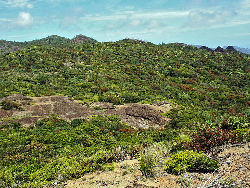 Scierophyllous scrubs extend out primarily from Higashidaira on the central moun-tamn of Chichijima Island and on Anijima Island. Endemic plants that grow here have evolved in such ways as changing the shape of their leaves to small and thick in conjunction with the dry climate, or being stunted to avoid strong coastal winds.