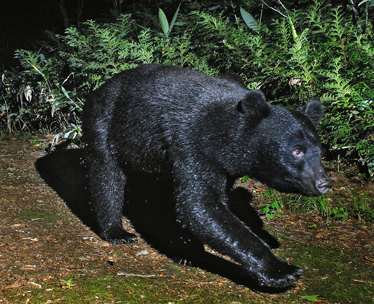 The Japanese black bear has a body length of 120-145 cm and weighs 70-120 kg. It is characterized by a white "crescent moon" on the chests, and is the largest land mammal in Honshu. While it is omnivorous, vegetable matter makes up a large portion of its diet.