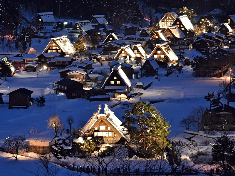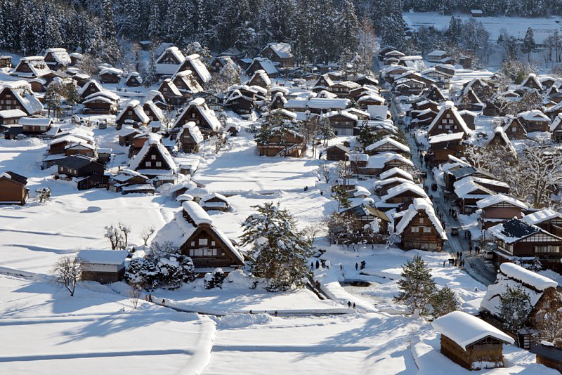 Around early march, it is possible to see the gassho style houses with snow on their roofs. Snow remains here and there around the village until around April.