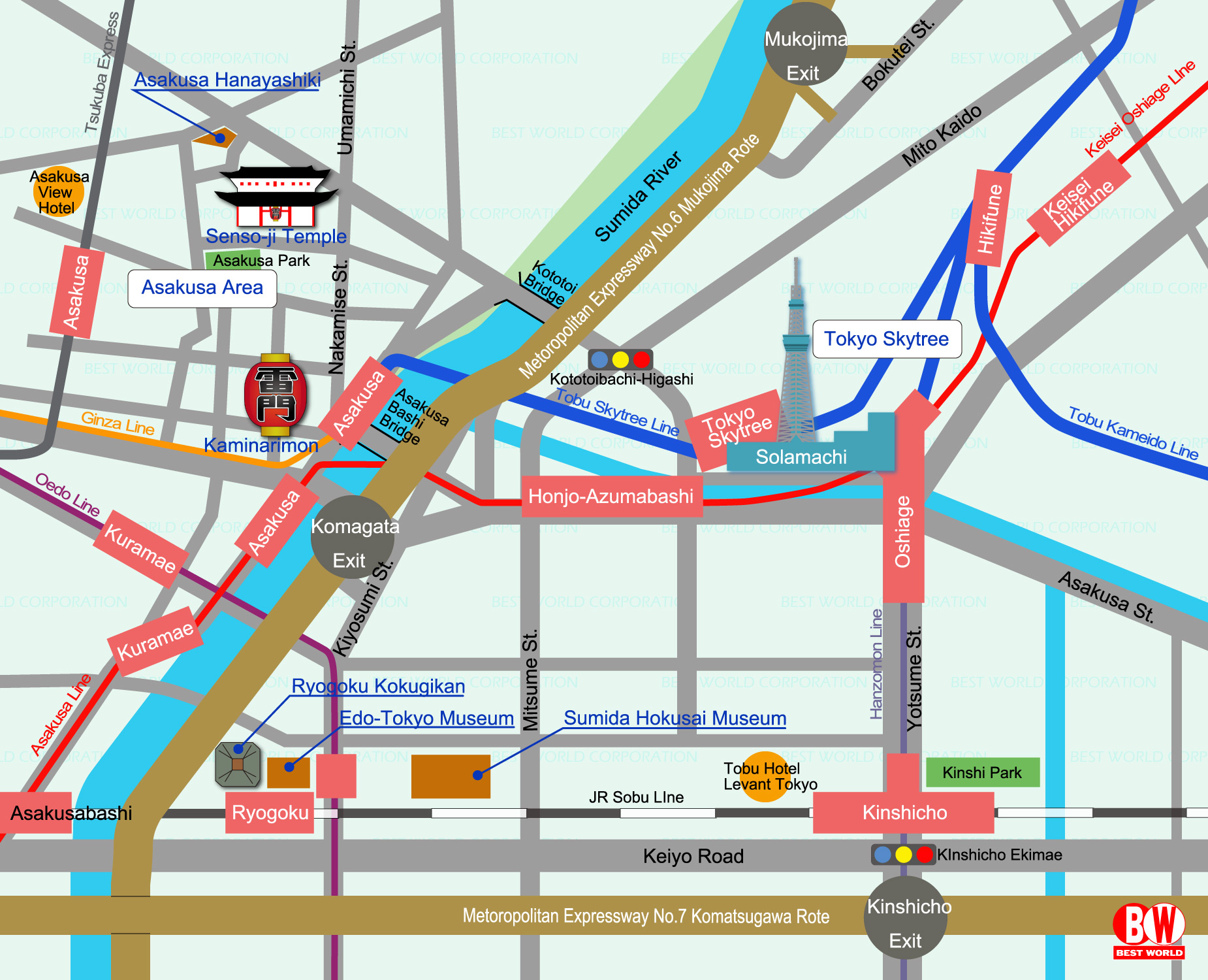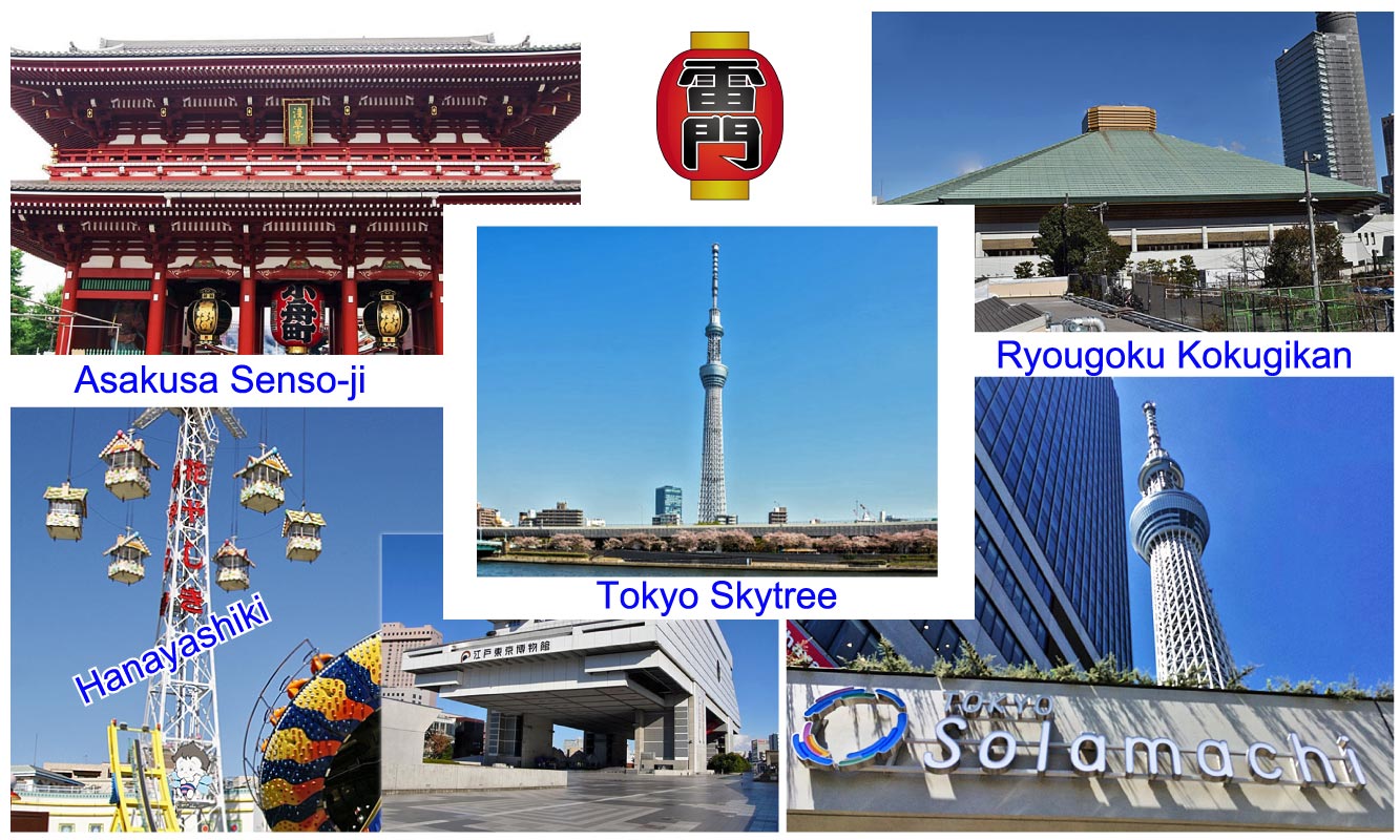 The Tokyo Skytree is a television broadcasting tower and landmark of Tokyo. It is the centerpiece of the Tokyo Skytree Town in the Sumida City Ward, not far away from Asakusa. With a height of 634 meters (634 can be read as "Musashi", a historic name of the Tokyo Region), it is the tallest structure in Japan and the second tallest in the world at the time of its completion. A large shopping complex with aquarium is located at its base.(Quotations from japan-guide.com)